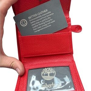 Sleek and stylish red leather wallet. Features Timberland logo. Perfect for everyday use.