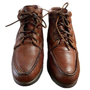 Classic Timberland brown leather Gore-Tex waterproof chukka boots — durable, preppy, and timeless. Made with genuine full-grain leather uppers, padded collars, and sturdy rubber lug soles for traction and comfort. Lace-up closure with round rawhide laces and embossed Timberland logo. Vintage construction from the 1980s, built to last through both outdoor trails and casual everyday wear.