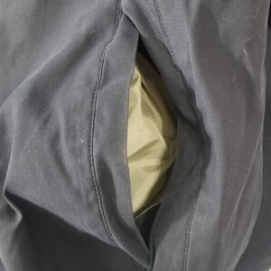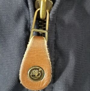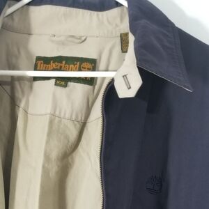 Timberland Weather Gear Navy Blue Full Zip Jacket. Double Lined. Size XXL. Dual Front Hand Pockets and Interior Keep Sake Pocket. Elastic Sleeve Cuffs. Shell: 90% Polyester 10% Nylon. Lining #1: 100% Cotton. Lining 2: 100% Nylon. Excellent Condition.
