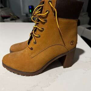 Stylish brown heeled boots with lace-up design. Durable and chic for any outfit.