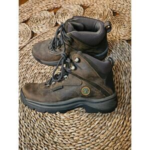 Like new condition! These durable Timberland boots feature a rugged waterproof leather exterior, supportive padded ankle collar, and heavy-duty traction soles, perfect for hiking, outdoor adventures, or everyday wear.