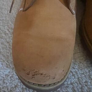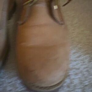 Stylish and durable tan lace-up boots for women. Toes of these have some stuffs and some pen marks on one part of the boot shown in the photos. Size 6.