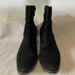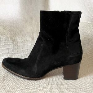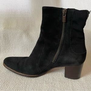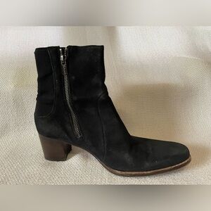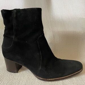 Zipper for easy on/off. Stacked heel. Back of boot is nylon feeling fabric Soles are in excellent shape. There are some spots on suede where they have rubbed. A good suede brush should help.