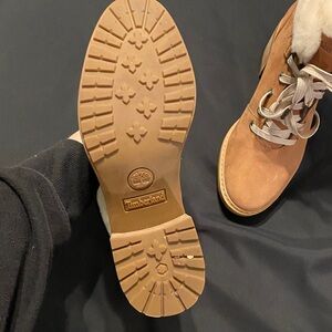 Only worn once! These cute boots are perfect for fall. They have a white trim and are a shade lighter than the usual Timberland tan.