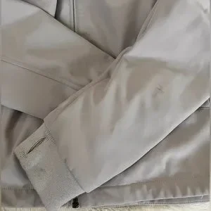 Men’s size small. Like new condition, very minor stain and wear on sleeves (see pictures). 3 pockets (one of theme is a zip pocket on the left sleeve). Hooded. This would make a good spring jacket.