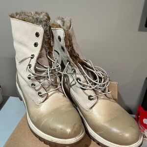 Timberland fur lined boots. White with cream toes. Leather with suede upper. Very warm and water resistant. Some toe wear/ rubbing as pictured. Soles like new. Only worn a few times. Size 9m women’s.