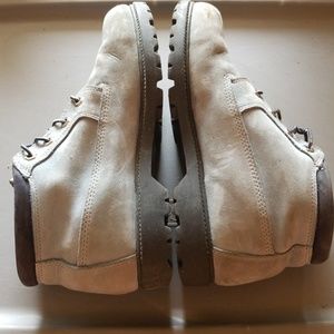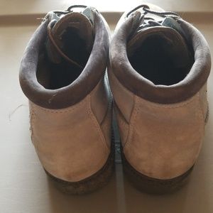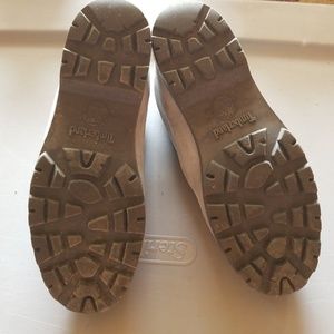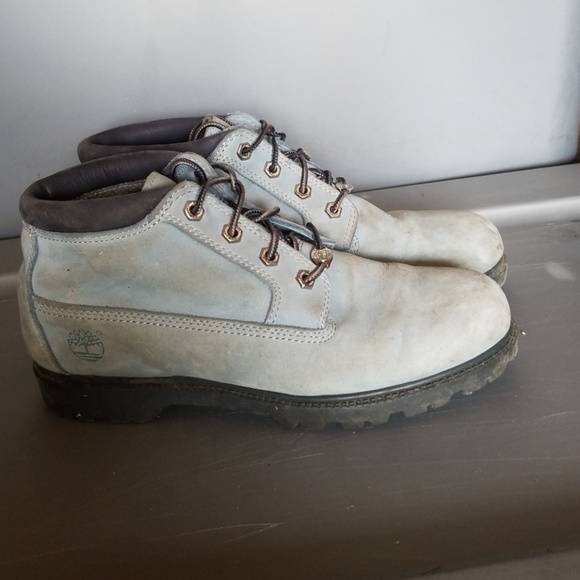 Blue TImberland work boots. Mid ankle. Used condition. Is scruffed and a little discolored.