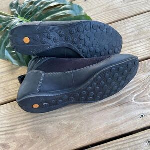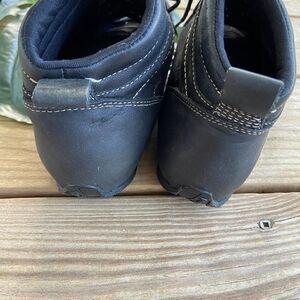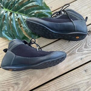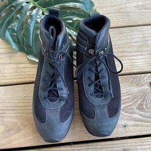 Black leather lace up high top sneakers. Shows some wear on the soles but over look really good.