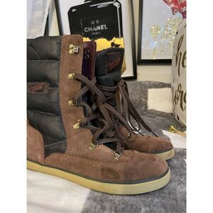 Timberland Deering Puffy Lace Up Boot. Women's size 9. Preowned condition, some wear. See all photos. Soles are naturally yellow. Like a soft, cozy parka for your foot, Timberland's snug and snazzy Deering takes the sting out of the season's first--and last--snowfall. The combo leather and synthetic boot features horizontal rear stitching for a playfully puffy approach to the cold, while its laced front and mid-calf cut offer a perfect fit that also blocks out the elements. Warmly lined with a comfortable EVA footbed and rubber sole, it's a smart and stylish way to suit up for winter's worst. Synthetic lining for comfort