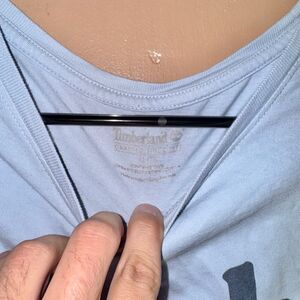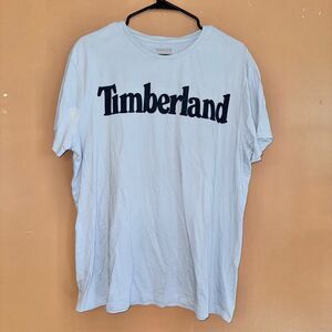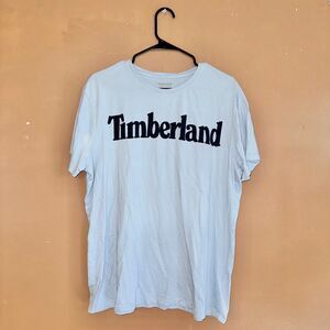 This baby blue t-shirt is in good condition and features a dark blue Timberland logo on the front.