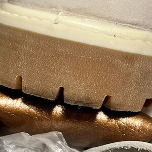 Beautiful super light gray suede boot with copper padded ankle trim. Lace up front - rubber sole - all copper colored hardware. Hardly worn, practically new with a couple really like colored dirt scuffs that are hard to see. A dark spot on the very edge of one heel.