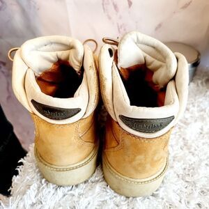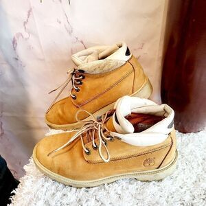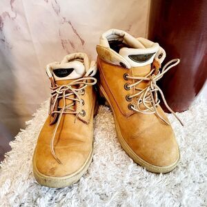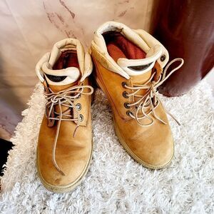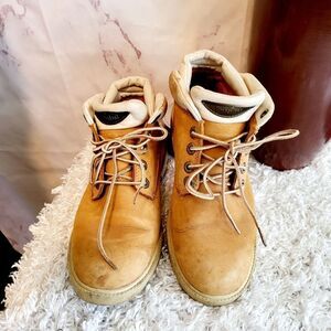 Good condition Timberland leather upper rubber lug sole metal grommet lace up detail. Size 5