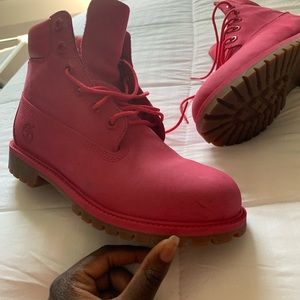 Pink timberlands, is a kids 6.5 however fits woman’s size 8.