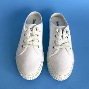 White canvas slip on sneakers with lowered mule back. Made by Timberline. Cute, comfy, casual and classic. Ready for anything. In the original box. Hard to tell if or how much they may have been worn.