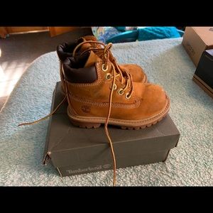 Used they do have scuff marks as seen in picture worn maybe 4-5 times they were to heavy on his feet lol
