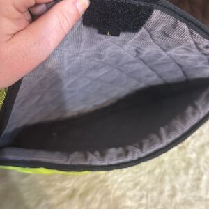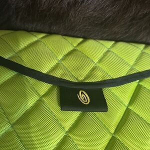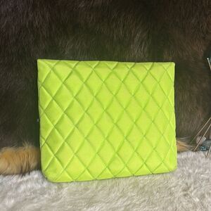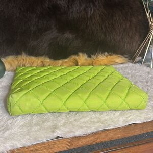 This lime green bag is in great condition. It measures 14.5 inches across and is 12 inches high. It’s 2 inches wide.