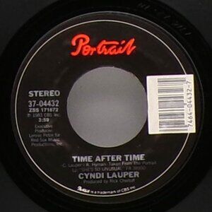 "Time After Time" is a song by American pop singer Cyndi Lauper from her debut studio album, She's So Unusual (1983). It was released as the album's second single in March 1984, by Epic and Portrait Records. Written by Lauper and Rob Hyman, who also provided backing vocals, the song was produced by Rick Chertoff. It was written in the album's final stages, after "Girls Just Want to Have Fun", "She Bop" and "All Through the Night" had been written or recorded. The writing began with the title, which Lauper had seen in TV Guide, referring to the science fiction film Time After Time (1979).