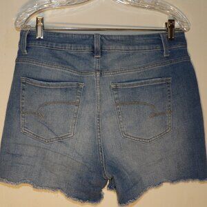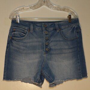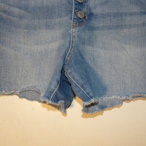 medium wash is faded to light in places , button fly , raw hems could be DIY from jeans , 5 pocket style with belt loops , material is 66% Cotton 23% Polyester 10% Rayon 1% Spandex , Sz 14 Rise measures 11.5" ( high rise ) Inseam measures 4" Waist lying flat measures 16" , decent wearable used condition no holes or stains shows minor to moderate washing wear , pet friendly non smoking home