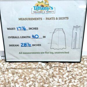 No visible flaws. Waist = 17.5 inches, Overall Length = 40 inches, Inseam = 28.5 inches.