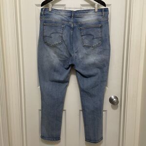 These are Time and Tru light wash skinny jeans in a womens size 20. They are a stretchy material. They have some light distressing. They are in excellent preowned condition. Measurements are included in photos.