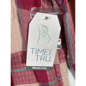 This Time and Tru maternity button-up top features a stylish pink plaid design. Crafted from a rayon blend for comfort, it suits a professional wardrobe.