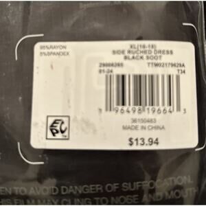 This stylish and comfortable black maternity dress from Time And Tru is perfect for any casual occasion. The dress features a flattering scoop neckline and short sleeves, with a pullover closure for easy wear. The semi-fitted design with side ruching and stretch features provides both style and comfort, while the knee-length cutoff adds a touch of elegance. Size Large 12/14.