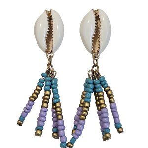 Time And Tru Shell & Blue Beaded Tassel Beach Boho Dangle Drop Pierced Earrings