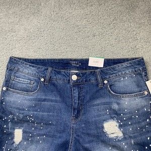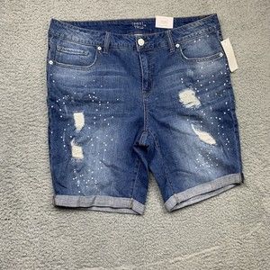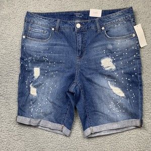Time And Tru Shorts Womens 18 Denim Bermuda Distressed Paint Splatter Cuffed. Five pockets. 99% cotton 1% spandex. New with tags. See pictures for measurements.