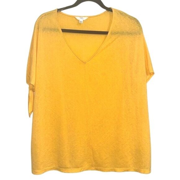 This vibrant yellow top by Time And Tru features a relaxed fit and stylish tie-sleeves. Its V-neck design adds a touch of elegance, while the soft blend of rayon and recycled polyester ensures comfort. This top is ideal for casual outings and adds a cheerful pop of color to any wardrobe.