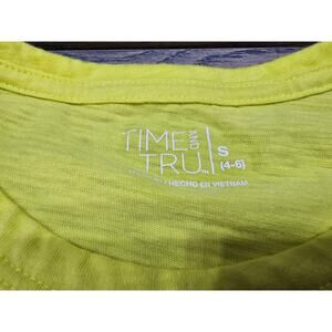 Time And Tru Women's Yellow T Shirt Size Small 4-6. 60% Cotton, 40% Recycled Polyester. RN# 52469. Condition is used, good clean used condition. Measurements are approximately 23" Long, 15.5 Underarm To Underarm And Weight is 3.5oz.