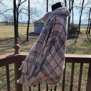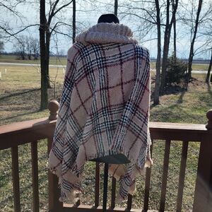 Snuggle up in this ultra-soft plaid poncho, perfect for crisp fall days and cozy evenings. Features a chunky knit turtleneck, asymmetrical hem, and neutral tones of beige, navy, and cranberry plaid. One size fits most — tagged L/XL.