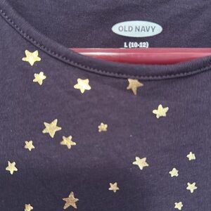 Nice Old Navy cotton girls dress, fits 12-14, embellished with gold stars on the scoop neckline. 3/4 length sleeves, flared skirt, 32” long, 14” at the chest. Machine washable. Worn once.