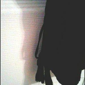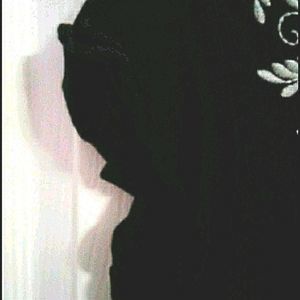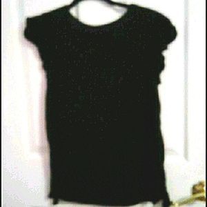 Black blouse with a white floral embroidery. Short ruffled sleeves. Has a string for rushing on the sides. Body is 100% rayon and embroidery is 100% polyester.
