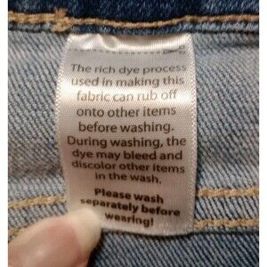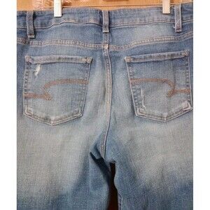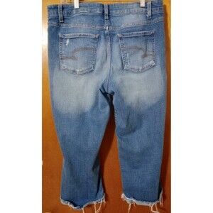 Women's Time And Tru denim capris, size 12. Medium wash, distressed 5 pocket design with cuff hem. Has a little stretch. The button has been replaced. GUC
