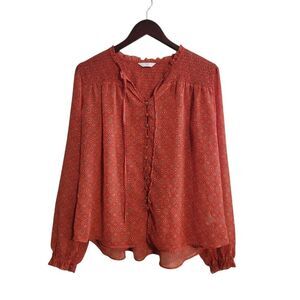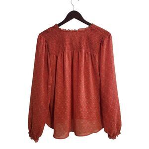 Time & Tru Orange Pleated Sheer Peasant Top Large
