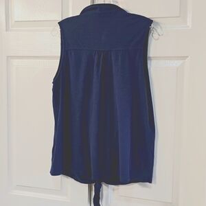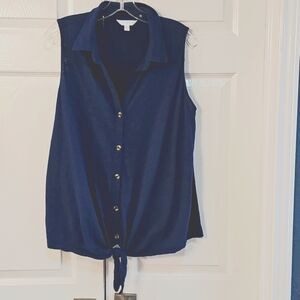 Elevate your wardrobe with this stylish navy sleeveless button-up top that ties at bottom.