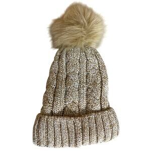 Time & Tru Women's Hat with Pompom OS Beige Tan Cable Knit Faux Fur Lining