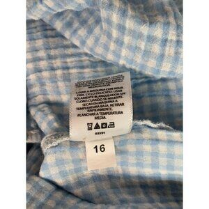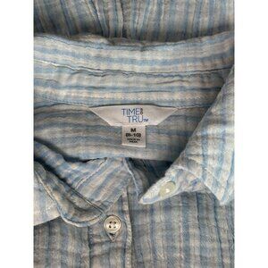 This Time & Tru button-up shirt features a classic blue and white striped pattern, offering a timeless look. Made from a soft cotton blend, it provides comfort and style for daily wear. The shirt is designed with a front pocket and button closure for a polished appearance.