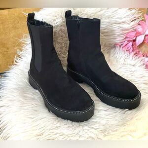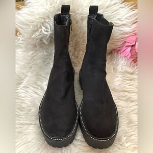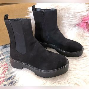 Black faux suede short booties with thick lug soles trimmed with rhinestones