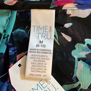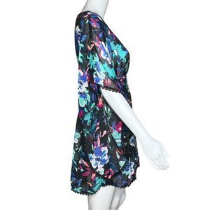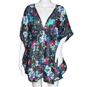 Time & True Swim Cover Up Women Medium Black Multicolored Floral Kimono Pom Poms