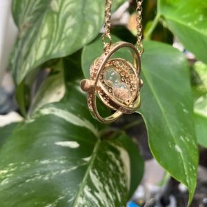 Hello! This is a listing for a Time Turner Necklace, the pendant is 2 inches across 1.5 inches top to bottom, the chain is 24 inches. Made of Alloy metal, the rings fully rotate and the sand is fluid. Engraved around the rings are the words “