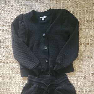 Stylish black quilted sweatsuit outfit. Comfortable fit with button-up top. Perfect for casual wear. top has balloons sleeves. Great details