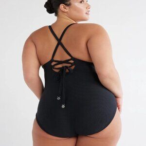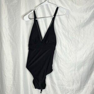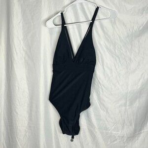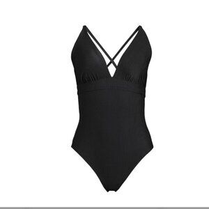Keywords: Time and Tru swimsuit, black one-piece, ribbed swimsuit, deep V swimwear, tie-back bathing suit, adjustable strap swimsuit, pool party outfit, resort wear, modest sexy swimwear, classic black swim, small swimsuit, Walmart swimwear