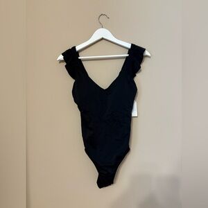 Stylish black one-piece with ruffle sleeves. Perfect for beach or pool. Let me know if you have any questions (: