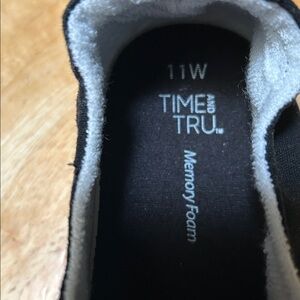 Comfortable black sneakers with soft white trim. Ideal for everyday use. Time and Tru black and white Canvas Sneakers with White Laces. New condition. Size 11 wide. Bought but a little too big. Never worn. See photos for details. Bundle with other items for discounts.