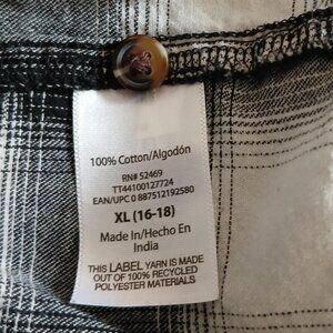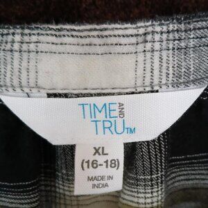 Time and Tru Black White Tiered Plaid Shirtdress Puff Sleeves, Size XL. 100% Cotton. Machine washable. Relaxed fit. Split V-Neck. Button down front closure, 2 side slit pockets, gathered waist; flounce hem; unlined.