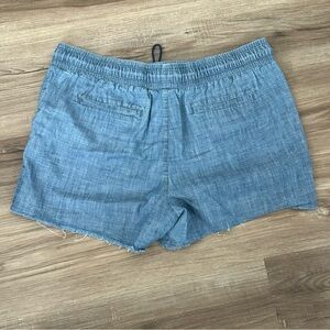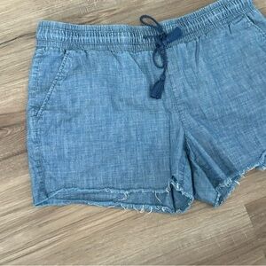 Time and Tru Blue Chambray Raw Hem Shorts Women Size Large in Great condition / elastic waist with tassel drawstring/ has pockets