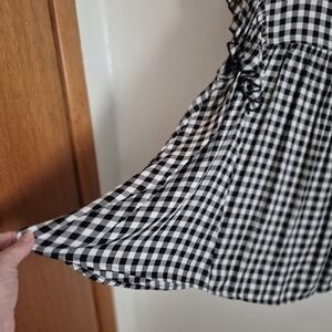 Elegant checkered baby doll blouse with double ruffle short sleeves. Super soft, comfortable n roomy. Great with jeans and boots or dress pants. Never worn. Only tried on.