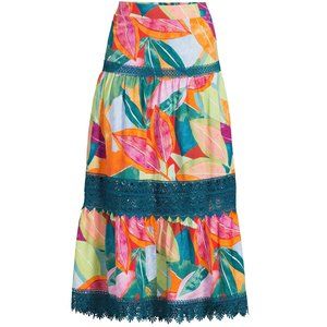 Vibrant maxi skirt with floral pattern. Features bold colors and lace trim. Perfect for a stylish look.