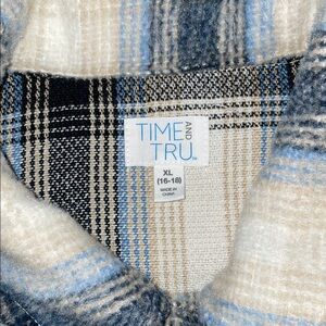 Stylish checkered top by Time and Tru. Features cream and blue tones. Has a few picks in the cloth.